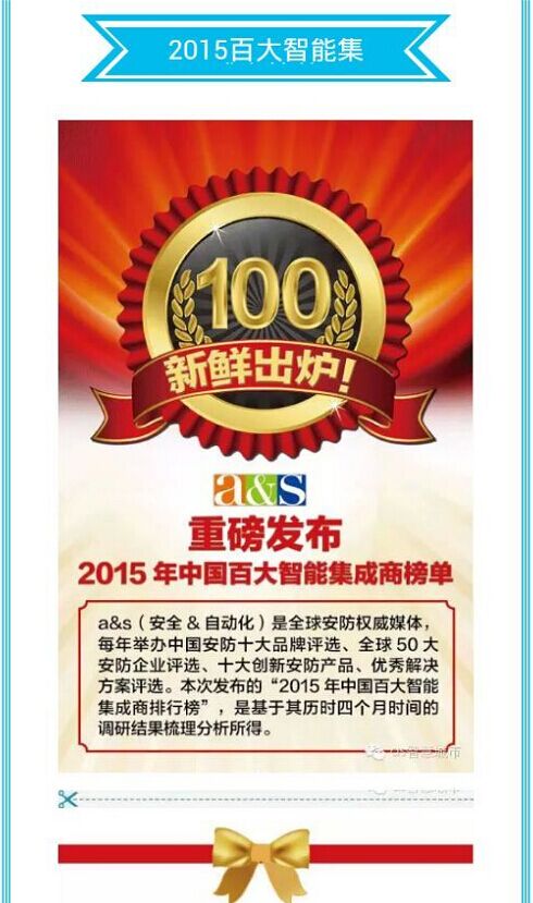 由安全&自動(dòng)化雜志承辦,工信部下屬中國電子學(xué)會(huì)信息系統(tǒng)集成分會(huì)主辦的第一屆百大智慧安防集成商評(píng)選活動(dòng),吸引了來自智能化產(chǎn)業(yè)的超過200位高端嘉賓參會(huì),包括政府部門、國內(nèi)外知名智能化企業(yè)以及智能化產(chǎn)業(yè)的專家、學(xué)者、企業(yè)高管、技術(shù)總監(jiān)等,經(jīng)過長(zhǎng)達(dá)4個(gè)月的角逐,我公司從評(píng)選活動(dòng)的6萬名智能集成商中脫穎而出,獲得“2015中國百大智能集成企業(yè)”的榮譽(yù) 。a&s(安全&自動(dòng)化)是全球安防權(quán)威媒體,每年舉辦全國安防十大品牌評(píng)選、全球50大安防品牌評(píng)選、十大創(chuàng)新安防產(chǎn)品、優(yōu)秀解決方案評(píng)選。本次發(fā)布的“2015年中國百大集成商排行榜”是經(jīng)過四個(gè)月調(diào)研結(jié)果梳理分析所得。