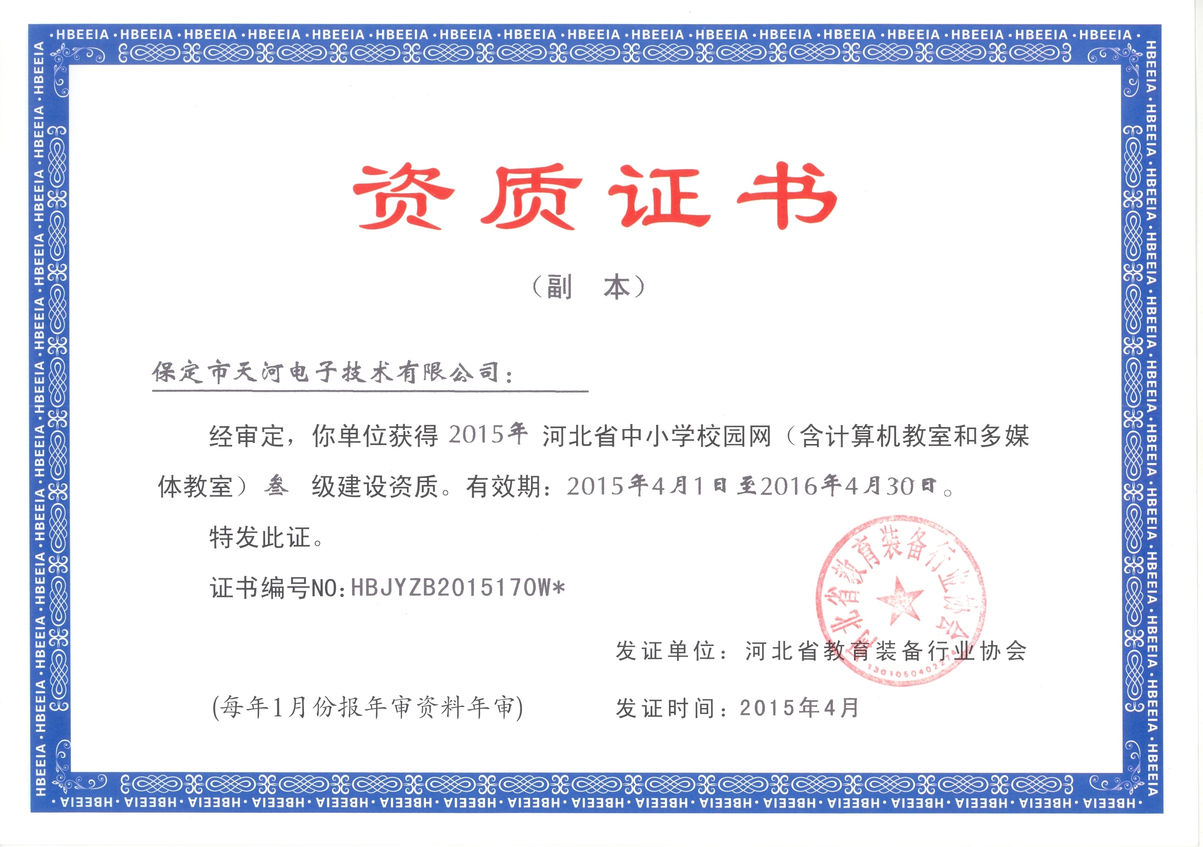 2015年4月我公司獲批河北省中小學校園網(wǎng)(含計算機教室和多媒體教室)叁級建設(shè)資質(zhì)